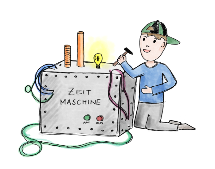 Emil, überrascht von der plötzlichen Anwesenheit seines Großvaters, zuckte zusammen. «Grospapi, ich versuche eine Zeitmaschine zu bauen! Ich möchte in die Vergangenheit reisen, um mehr über die alten Strassenbahnen in Luzern herauszufinden!»